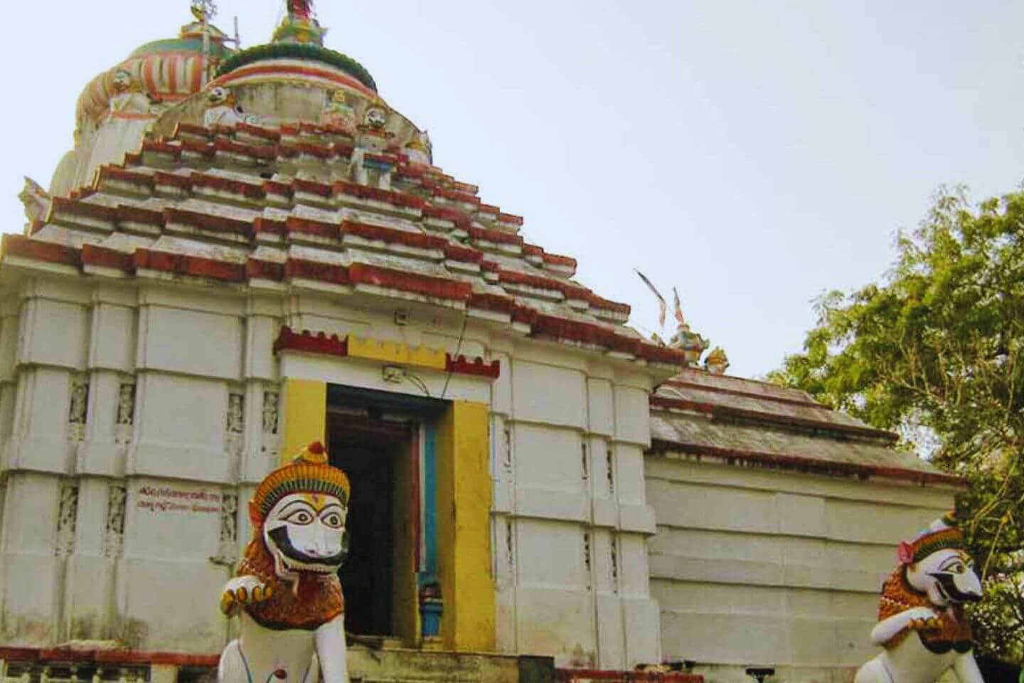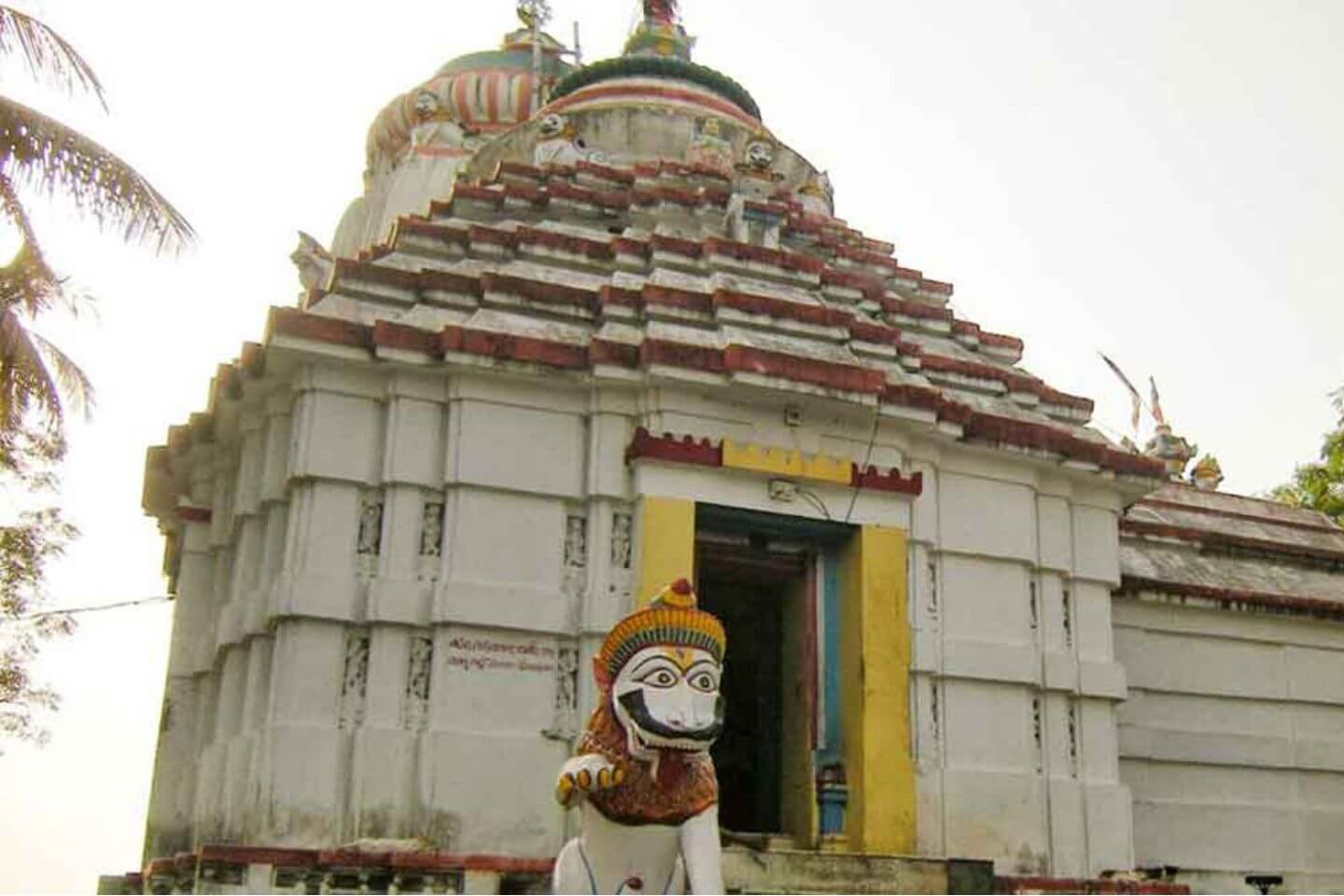 The main temple features statues of two lions, represented as guards of the temple. The top of its entrance door has elaborate carvings on it. The temple has a prayer hall and adjoined to it is the main sanctum. The spire of the main sanctum resembles the Kalinga temple style of architecture.